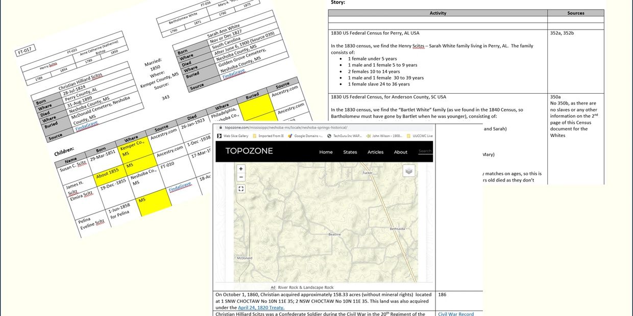 Family Tree Documents are where I collect all of the facts about a particular family. These differ from Research Documents in that I am not sure all of the information in the Research Documents is true. However, the information in Family Tree documents is as true as I can determine. It's based on Federal and State Censuses, FindaGrave information (although sometimes that information is a little suspect), and other authoritative documents. As you read the facts in the Family Tree documents, you can see which Sources I cited.